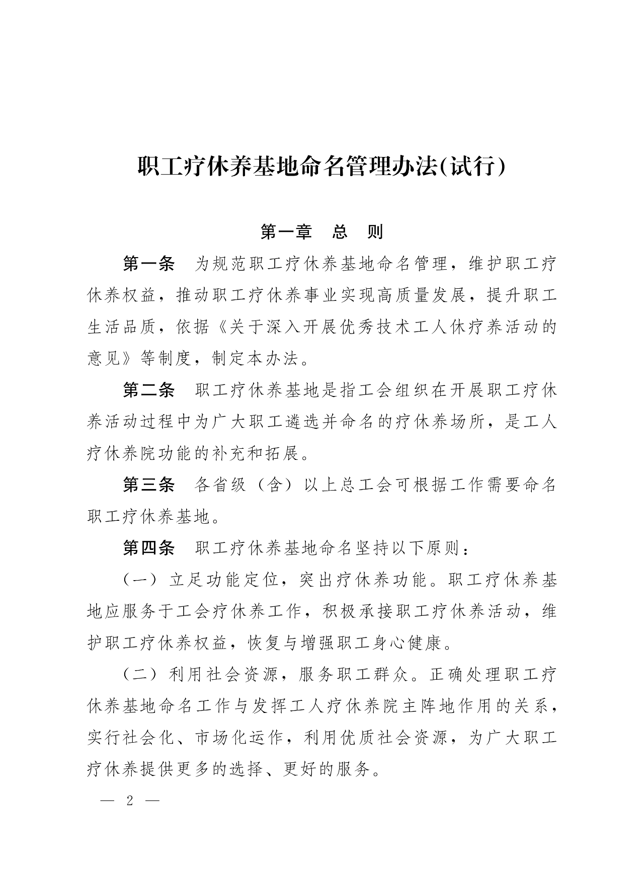 近日,全國(guó)總工會(huì)辦公廳印發(fā)《職工療休養(yǎng)基地命名管理辦法(試行)》(以下簡(jiǎn)稱《辦法》),以規(guī)范職工療休養(yǎng)基地命名管理,維護(hù)職工療休養(yǎng)權(quán)益,推動(dòng)職工療休養(yǎng)事業(yè)實(shí)現(xiàn)高質(zhì)量發(fā)展,提升職工生活品質(zhì)。