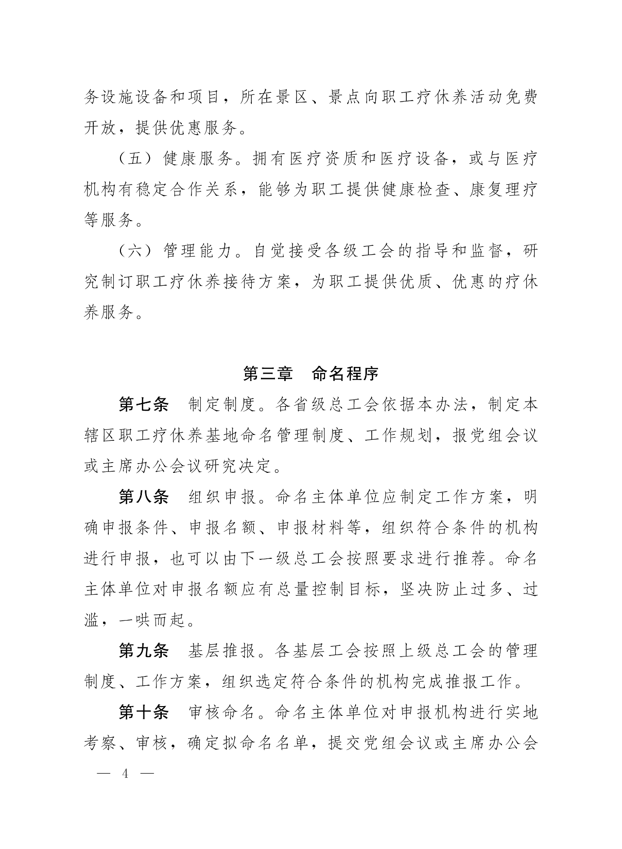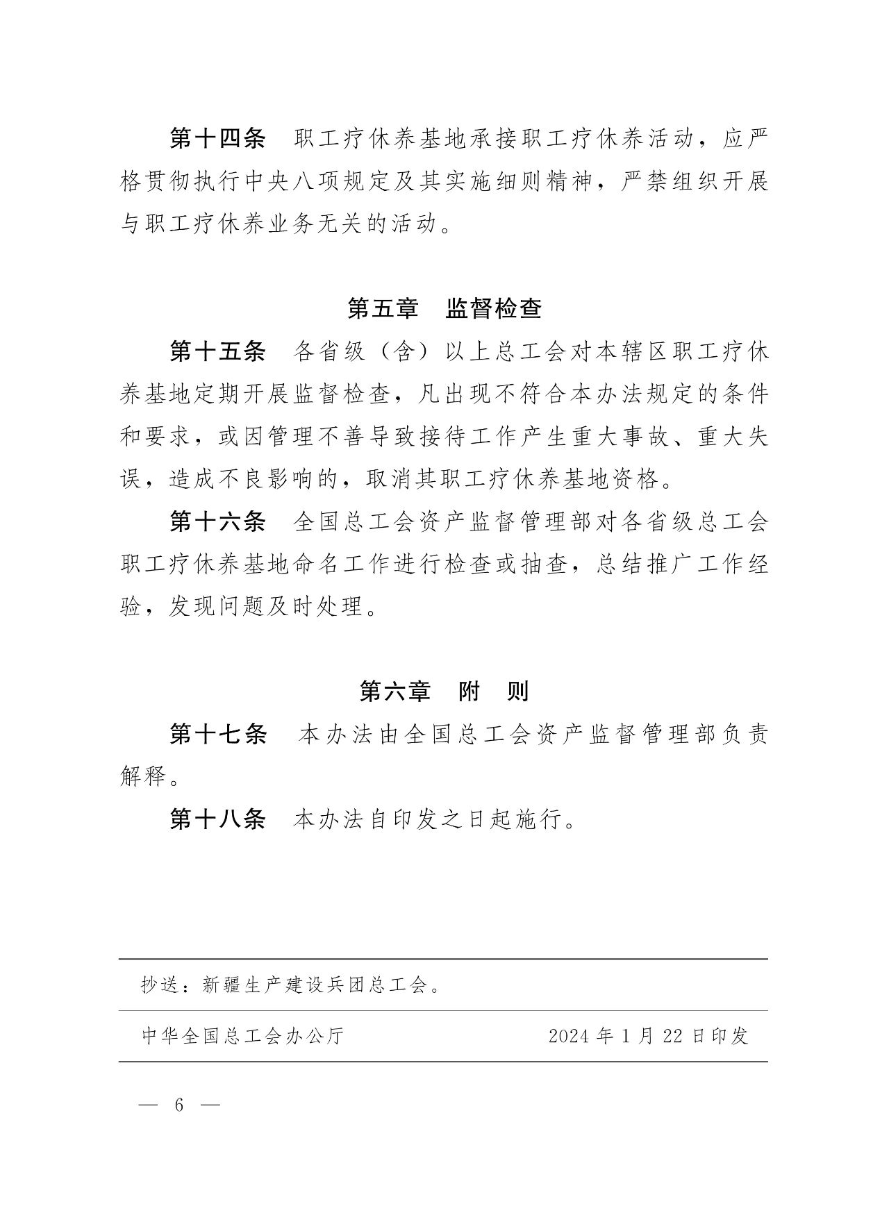 《辦法》要求,各省級(jí)總工會(huì)制定本轄區(qū)基地命名管理制度、工作規(guī)劃,履行制定制度、組織申報(bào)、基層推報(bào)、審核命名等命名程序。各級(jí)總工會(huì)對(duì)所命名的基地履行監(jiān)管主體責(zé)任,健全管理制度,加強(qiáng)指導(dǎo)監(jiān)督,定期監(jiān)督檢查。充分發(fā)揮基地在開展職工療休養(yǎng)活動(dòng)中的積極作用。建立考核評(píng)價(jià)機(jī)制、退出機(jī)制,制定考核評(píng)價(jià)標(biāo)準(zhǔn),設(shè)置否決事項(xiàng),實(shí)施動(dòng)態(tài)管理。