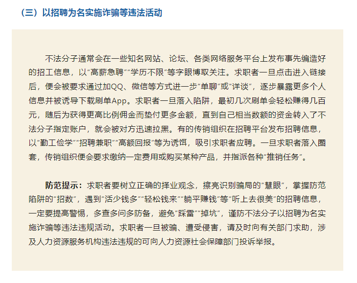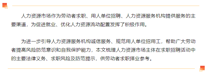 為進(jìn)一步引導(dǎo)人力資源服務(wù)機(jī)構(gòu)誠信服務(wù)、規(guī)范用人單位招用工,幫助廣大勞動者提高風(fēng)險防范意識和自我保護(hù)能力,本文梳理人力資源市場主體在求職招聘活動中的主要法律義務(wù)、求職風(fēng)險及防范提示,供勞動者求職擇業(yè)參考。