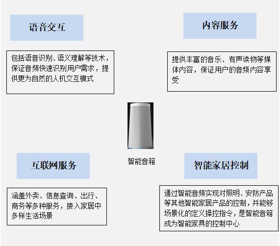 智能音箱是在傳統(tǒng)音箱基礎(chǔ)上增加了智能化功能,這功能體現(xiàn)在兩方面:一是技術(shù)上具備WiFi鏈接可語(yǔ)音交互;二是功能上可提供音樂、有聲讀物等內(nèi)容服務(wù)、互聯(lián)網(wǎng)服務(wù)以及場(chǎng)景化智能家居控制能力。