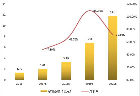 根據(jù)艾媒咨詢數(shù)據(jù)顯示,2016年中國(guó)智能音箱銷售規(guī)模為1.36億元,預(yù)計(jì)2017年將突破兩億,達(dá)到2.01億,增長(zhǎng)率為47.8%;預(yù)計(jì)到2020年,智能音箱銷售規(guī)模將超過10億元。目前雖眾多廠商已推出智能音箱產(chǎn)品,但市場(chǎng)總體銷售規(guī)模仍處于較低水平,隨著產(chǎn)品進(jìn)一步優(yōu)化升級(jí)及智能家居的推廣,中國(guó)智能音箱消費(fèi)市場(chǎng)潛力將得到釋放,行業(yè)有望迎來爆發(fā)式增長(zhǎng)。