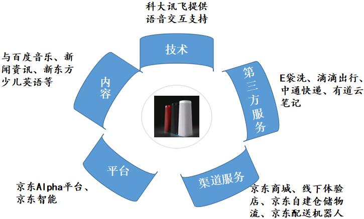 2.通過強(qiáng)強(qiáng)聯(lián)合的方式,京東通過電商平臺(tái)優(yōu)勢(shì),整合行業(yè)中的技術(shù)廠商、內(nèi)容廠商及第三方服務(wù)廠商,并發(fā)起“京東智能音頻聯(lián)盟”,向聯(lián)盟內(nèi)成員輸出“JD+智能音頻解決方案”,實(shí)現(xiàn)叮咚音箱產(chǎn)品與優(yōu)質(zhì)內(nèi)容、服務(wù)的結(jié)合。