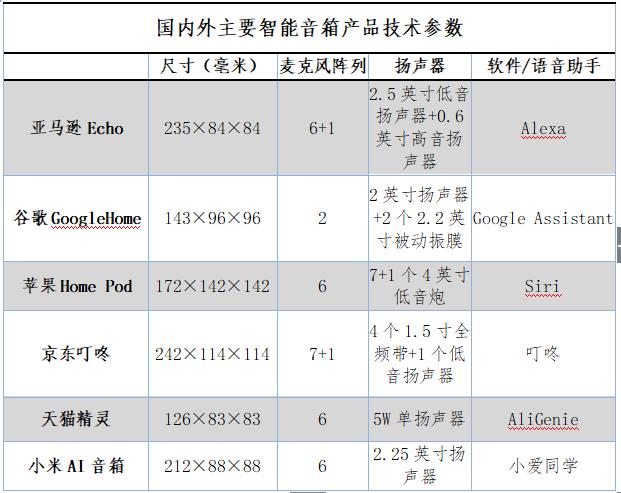 國(guó)內(nèi)外主要智能音箱產(chǎn)品技術(shù)參數(shù)