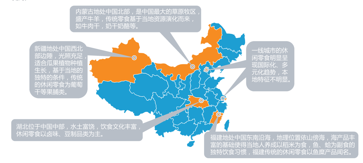 休閑食品的生產(chǎn)與農(nóng)業(yè)資源緊密相連。不同的地域有著截然不同的農(nóng)業(yè)資源,產(chǎn)業(yè)集中度較高,由此形成了眾多具備獨特資源優(yōu)勢的休閑食品品類,引領(lǐng)著中國休閑食品的發(fā)展潮流。目前,已經(jīng)興起了諸如福建軍團、安徽炒貨軍團、湖南辣食品、河南速凍食品軍團等一大批優(yōu)秀的休閑食品企業(yè)。