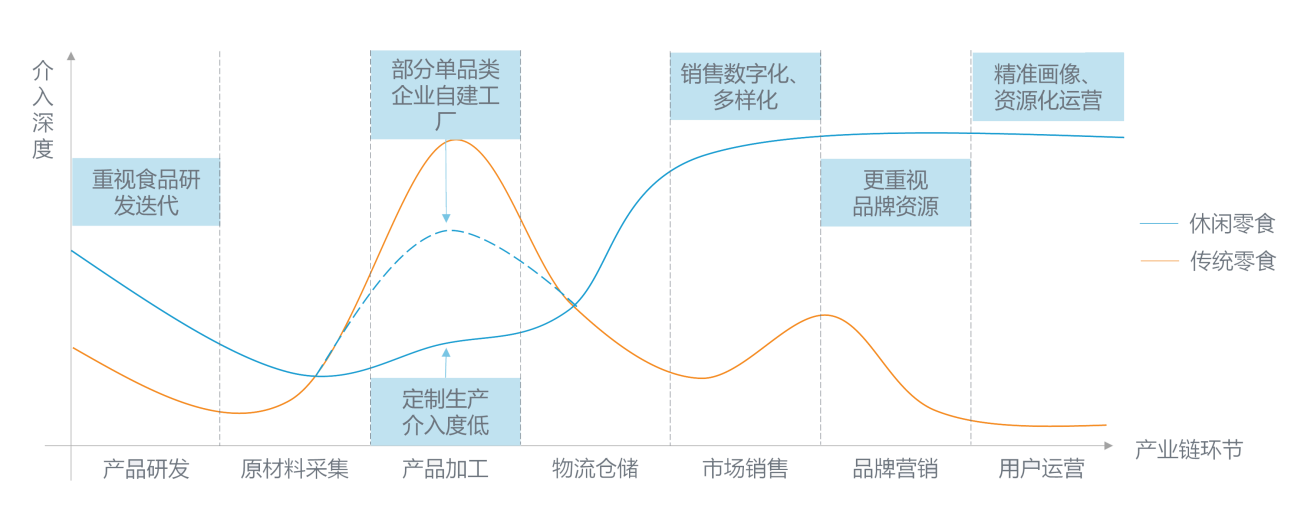 這一類企業(yè)極為重視整體產(chǎn)品與服務(wù)的質(zhì)量,通過更高程度參與全產(chǎn)業(yè)鏈、強質(zhì)檢倒逼上中游的方式,向市場輸出價格高、品質(zhì)高的產(chǎn)品。這類企業(yè)多實行多品類策略,故無法自建生產(chǎn)線,典型代表為良品鋪子。 |