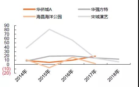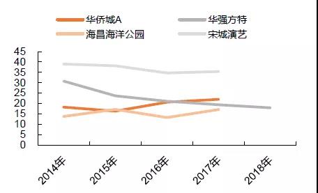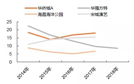 華強(qiáng)方特營(yíng)業(yè)收入近年來(lái)穩(wěn)步提升,增速維持在10%以上,但新項(xiàng)目投產(chǎn)初期尚未實(shí)現(xiàn)盈利,歸母凈利潤(rùn)在經(jīng)歷了2014、2015兩年的減少之后,又迎來(lái)5%左右的增速。華強(qiáng)方特毛利率高于其他公司,但由于不斷攀升的銷售費(fèi)用,凈利率持續(xù)下降。公司走輕資產(chǎn)化方案,資產(chǎn)負(fù)債率逐年下降。由于華強(qiáng)方特業(yè)務(wù)擴(kuò)張較快,新項(xiàng)目盈利能力不如人意,因此ROE持續(xù)下降。