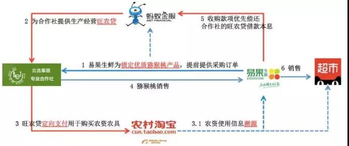 例如:天貓超市的供貨電商易果生鮮與陜西周至縣北吉果蔬專(zhuān)業(yè)合作社簽訂采購(gòu)協(xié)議。螞蟻金服基于采購(gòu)訂單,在對(duì)訂單進(jìn)行識(shí)別并確認(rèn)后,由網(wǎng)商銀行為合作社數(shù)百名果農(nóng)社員提供低息貸款,果農(nóng)拿到這筆貸款后,通過(guò)定向支付工具專(zhuān)項(xiàng)用于從農(nóng)村淘寶購(gòu)買(mǎi)指定的農(nóng)藥、農(nóng)資、農(nóng)具。最后果品通過(guò)易果生鮮進(jìn)駐天貓超市進(jìn)行銷(xiāo)售。這種基于產(chǎn)業(yè)鏈形成的閉環(huán)信貸模式,突破了商業(yè)銀行傳統(tǒng)的評(píng)級(jí)授信要求,也無(wú)須另行提供抵押、質(zhì)押、擔(dān)保,提供的資金效率高、環(huán)節(jié)更簡(jiǎn)單,利率則遠(yuǎn)低于民間借貸。
