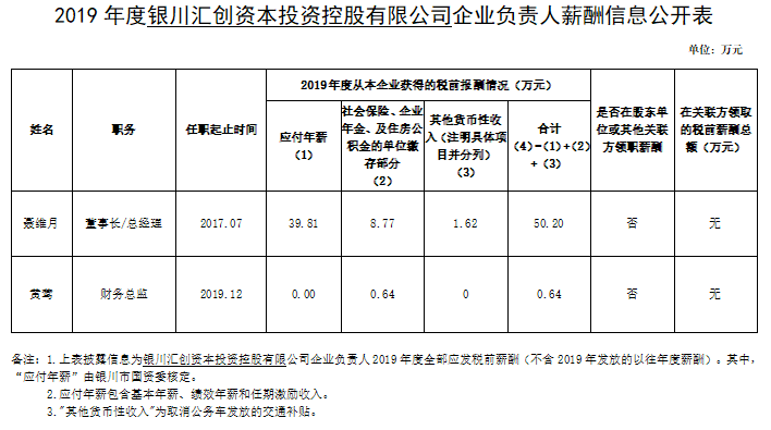 銀川匯創(chuàng)資本投資控股有限公司企業(yè)負(fù)責(zé)人2019年度薪酬情況