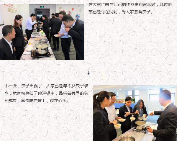 大家分成“愛吃餃子”“會做餃子”“多彩生活”和“幸?;▋骸彼膫€(gè)組合,展開了包餃子比賽。只見他們熟練的搟面皮、放餡料、捏餃子,十指翻飛之間,剁餡聲、歡笑聲、音樂聲,交織在一起,每個(gè)人臉上都洋溢著燦爛的笑容,公司里充滿了歡聲笑語,匯聚成了一片歡樂的海洋。